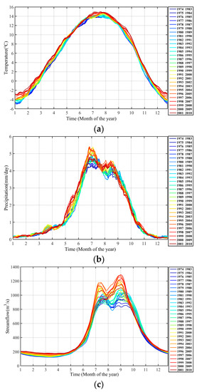 Shown in Figure 4, the inter-annual variation characteristics of the hydrometeorological variables can be clarified by comparing their trends over different years in the same day, and the intra-annual variation characteristics can be clarified by comparing their trends over different days in one year. As is illustrated in Figure 4a, the temperature generally showed an increasing trend from 1974 to 2010 on the same day, and the increase in temperature was very small. As shown in Figure 4b, the precipitation generally showed an increasing trend from 1974 to 2010 on the same day. The increase in precipitation in May, July and August was large, and a decreasing trend occurred in September. As in Figure 4c, we noted that the streamflow of 1990s (light red or yellow) was the largest, that of the 2000s (dark red) or 1980s (light blue) was the second largest, and that of the 1970s (dark blue) was the smallest. In the summer of 1998, the entire Yangtze River Basin suffered tremendous flooding. The 1998 Great Flood caused serious losses in industry and agriculture to the Yangtze River Basin [50]. According to Fluixá-Sanmartín et al. [51], an extreme drought event was observed from 1978 to 1979. A total number of 7000 km2 of agricultural land was seriously affected. Figure 4c also shows that the increase in streamflow from July to early September of the 1990s was relatively large compared with the 1970s and 1980s. From mid-September to early October, the streamflow showed a decreasing trend.