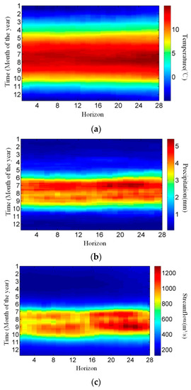Figure 5 is another way to show the results of MASH, which can illustrate the duration of different hydrometeorological processes intuitively, instead of the variations in variable magnitude. The magnitude of different hydrometeorological variables is illustrated using a color scale. Figure 5a clearly demonstrates that higher temperatures (>10 °C) were measured from June to September from 1974 to 2010. From Figure 5b, we see that higher precipitation (>4.5 mm) was measured in July from the 20th to the 25th horizon, which corresponds to the years 1993 to 2007. As is shown in Figure 5c, higher streamflow (>1000 m3/s) was measured in September, from the 17th to the 28th horizon, which corresponded to the years 1990 through 2010.
