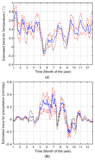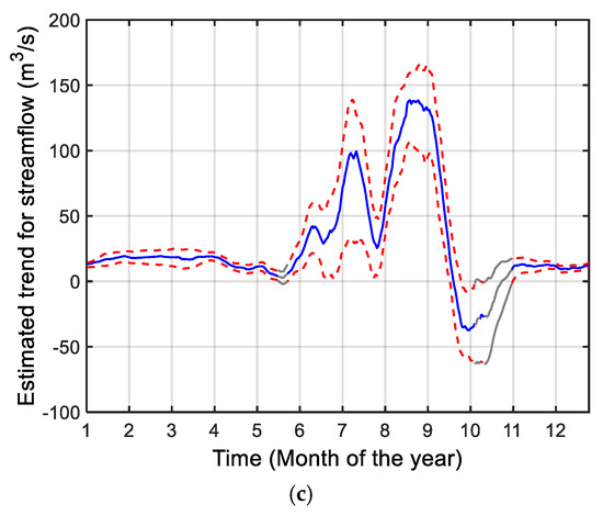 As can be seen for temperature, Figure 6a, the estimated Sen’s slope for a few days in mid-May was smaller than 0, which indicated decreasing trends. The estimated slope for the remaining days of the year was bigger than 0, which indicated increasing trends. The highest changes in temperature were estimated in early January, with a peak of 0.8 ℃. As can be seen for precipitation, Figure 6b, decreasing trends were detected from early September to early October while the rest of the year showed increasing trends. The highest changes in temperature were estimated in late June, with a peak of 0.4 mm/day. As can be seen for streamflow, Figure 6c, decreasing trends were detected from mid-September to late October. Increasing trends were detected the rest of the year. The highest changes in streamflow were estimated in mid-August, with a peak of 138 m3/s. Compared with the trend detection results for streamflow and temperature, the non-significant days for precipitation were more numerous (more grey dots).