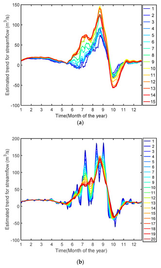 Since the estimated trend was sensitive to the choice of smoothing parameters, sensitivity analysis of the selection of smoothing parameters of w and Y was performed to increase the robustness of the estimated trends. The sensitivity analysis was performed by analyzing the influence of the smoothing parameters on the estimated trends. The estimated trends, based on Sen’s slope, were calculated under different w and Y parameters. We utilized the MASH results of streamflow time series as an example. The influences of the Y and w parameters on estimated trends are illustrated in Figure 7a,b respectively. To analyze the influences of the Y parameter, the w parameter remained at 15 while the Y parameter varied from 1 to 15 (Figure 7a). The estimated trends were nearly the same throughout the year, except for the period between early June and early July when negative trends were estimated when Y was set as 1 or 2.