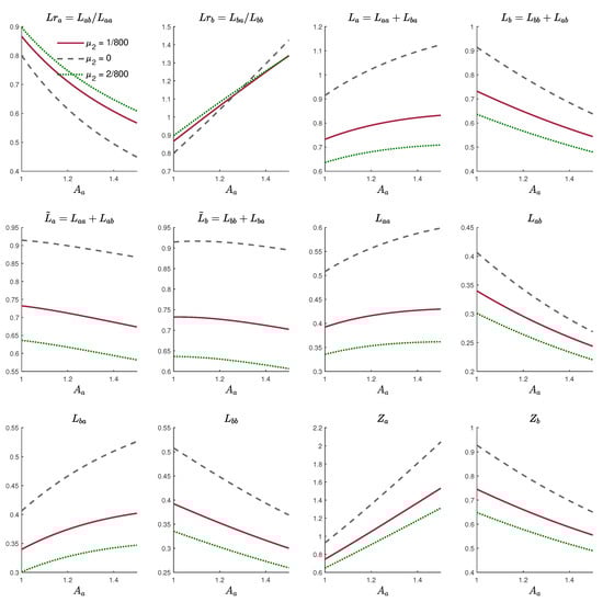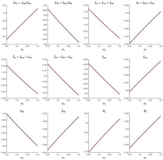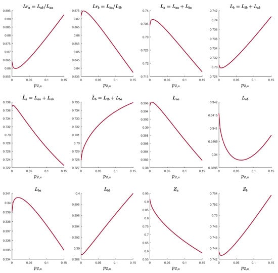 First, it is clear that higher TFP in city a attracts more labor to the city and hence increases the equilibrium labor in city a, while reducing the equilibrium labor in city b. It is worth noting that is increasing and is decreasing against , which implies that the household in city a switches labor to its home city as the home productivity level improves. This is because higher TFP raises the productivity of firms located in city a and thus leads to higher marginal productivity of labor and capital. As a result, firms would hire more labor and are willing to offer a higher wage rate. Likewise, the higher wage rate attracts households in city b to migrate to the city, and encourages them to switch their labor supply from city b to city which thus leads to an increasing and a decreasing against . In sum, as increases, the higher level of is indeed contributed to by both the local workers from city a and the migrant workers from city b. In contrast, since both and decrease, total labor in city b drops. The decreasing labor ratio and the increasing labor ratio both indicate that households in both cities are more likely to assign their labor to city a. Put differently, higher productivity in a city raises the chance of foreign workers moving in, and simultaneously reduces the chance of domestic workers moving out. Since more economic activities are concentrated in city a, it is evident that the emission would increase, while the emission falls. To conclude, higher productivity in a city would result in a positive relationship between emission level and degree of migration . In addition, the emission levels in the two cities are negatively correlated.
