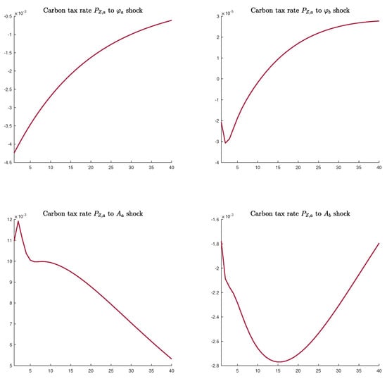 It is worth noting that the optimal environmental tax rate even increases to the shock when Further, the optimal environmental tax rate increases to the TFP shock in city b when . The IRFs of labor and air pollutant emissions shown from Figure A2, Figure A3, Figure A4 and Figure A5 with different values of move in the same direction, but vary with different magnitude.