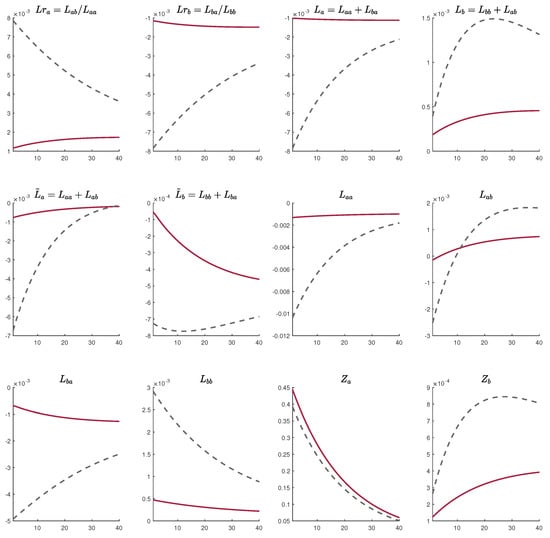 Next, we compare the path of variables with and . By increasing the value of , we are able to examine the role of environmental concern on households’ migration decision. As shown in Figure 2, a higher value of reduces both domestic and migrant labor in both cities. This is because, according to (2) and (3), an increase in raises both and , making both types of labor supply more undesirable to the households. Hence, aggregate labor in city a and city b drop simultaneously, while it is notable that the extent of changes in the two types of labor are different. As seen above, the labor ratio is increasing with , indicating that household a tends to assign relatively more of its labor in city This is intuitive, since workers who work in foreign city have a higher labor cost than those who work locally, according to the assumption that . With a higher environment cost , the higher fixed cost incurred by migration becomes less relevant, making households more willing to work in the foreign city.