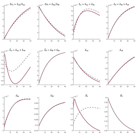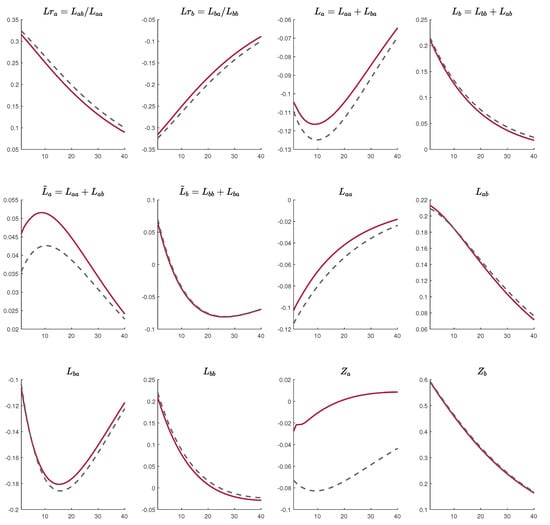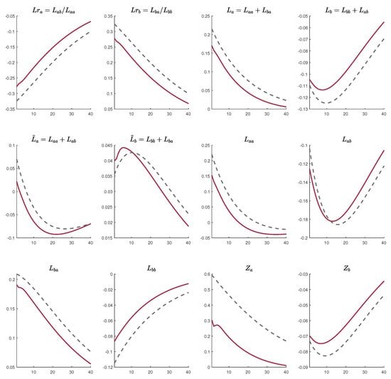 The choice of parameters is mostly based on the literature (All the parameters used directly follow the choice in Annicchiarico and Di Dio [12] with two exceptions: (i) the parameters of the two shock processes are set to be equal. First, the choice of these parameters would not affect the long-run analysis in Section 4.2 where the shocks are absent. Second, they only affect the persistence of the impulse response functions in Section 4.3. Since our results are qualitative, they are independent of these parameters. (ii) Parameters of labor disutility , , and are new to this paper. Again, our qualitative result only relies on the condition where . Further, various values of are considered in Figure 2 to ensure that the results are robust.) For simplicity, the two cities are assumed to be symmetric in the sense that most of the parameters in the two cities are assumed to be the same. The model is set so that each period represents a quarter.