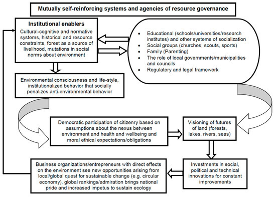 64] as the critical foundations for the sustainable environmental and natural resource governance. It is argued that global economic, ecological, and health crises or human development and quality of life are simply a mirror image of the prevailing institutions: cultural, cognitive and regulative and normative systems which together with activities and resources add meaning to life [