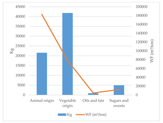 Comparing the food groups based on amount in kilograms and the WF, it was observed that foods of animal origin have a higher WF value considering the proportion of the supply in kilograms of these foods. The inverse situation between the amount in kg and WF of the food of plant origin is shown in Figure 3.