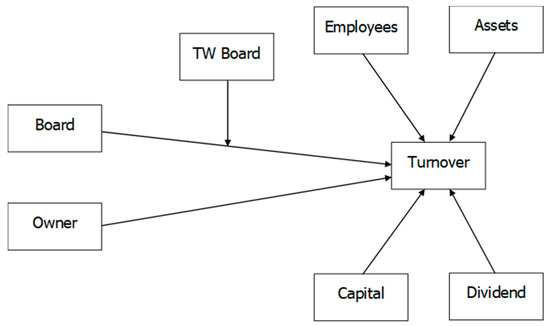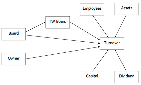 We used the standard method for identifying a moderating effect. This entails the addition of an interaction term (the use of social media by the board) to the multiple regression model. We followed the recommendations of various scholars for analyzing and interpreting this interaction [142,143,144,145]. Two moderating models were analyzed (Twitter and LinkedIn). Figure 2 depicts the first model where the use of Twitter by the board was considered as an interaction variable that moderates the relationship between the board and operating revenue (turnover).