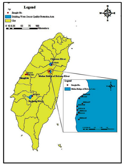 Sampling sites of three Drinking Water Source Quality Protection (DWSQP) areas and Changhwa (CH), Taiwan.