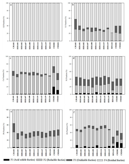 Risk assessment code (RAC) is a method used for evaluating the potential environmental risk of heavy metals leaching from the sample matrix [20]. The percentage of metals in acid soluble fraction (F1) in the BCR extraction method is a simple index applied to do it. When the percent ratio of F1 to the total metal concentration (i.e., RAC) is <1%, the heavy metal is considered to have no adverse impact on the environment. If the ratio is between 1 and 10%, a low risk is defined, while medium risk is defined within 11–30%, and 31‒50% indicates a high risk. A ratio higher than 50% indicates that the hazard risk to the environment is very high, because the heavy metal is readily released from the sample matrix. RAC was obtained based on the following, Equation (2):