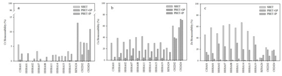 The bioaccessible Cr, Cu, and Zn obtained by using two in vitro chemical extraction methods are shown in Figure 4. The bioaccessibility was expressed as the percentage of Cr, Cu, and Zn contents extracted by in vitro experiments with respect to their total content in the soils. For Cr, the extraction results indicate that the bioaccessible values obtained by SBET (range: ND‒6.53%; average: 2.42%) were significantly greater than those obtained by gastric extraction of PBET (range: ND‒3.84%; average: 0.61%). The different pH, with values of 1.5 for SBET and 2.5 for gastric PBET, was the main factor to explain the different results of bioaccessibility. However, the extraction proportion of intestinal extraction (pH = 7.0) of PBET (range: 0.79‒13.1%; average: 3.87%) was relatively larger than those of the gastric phase (pH = 2.5) and SBET, showing the reason of formation of oxo-species in the neutral condition [63]. For Cu, the average value of bioaccessibility of SBET (range: 21.7‒60.4%; average: 37.6%) was larger than those of gastric extraction (range: ND‒72.2%; average: 12.8%) and intestinal extraction of PBET (range: 5.88‒70.6%; average: 22.6%). The proportion of intestinal extraction of PBET was larger than the gastric phase, due to the greater affinity of metal to the gastric solution and to metal binding competition between the gastric solution and sodium carbonate [64]. In addition, the bioaccessibility of Cu in the CH soils was relatively larger than those in the DWSQP areas, suggesting that the bioaccessibility of metals could be higher when their corresponding total content was also larger. For Zn, the experimental results show that the bioaccessible values of SBET (range: 5.37‒67.3%; average: 45.4%) were significantly larger than those obtained by gastric extraction of PBET (range: 5.00‒31.4%; average: 20.7%). In contrast, the proportion of intestinal extraction (pH = 7.0) of PBET (range: 0.93‒10.5%; average: 4.55%) was relatively smaller than those in the gastric phase extraction of SBET and PBET (pH = 1.5 and 2.5, respectively). These results suggest that Zn is more easily dissolved in an acidic condition, which is in consistence with the findings of a previous work [65].