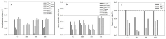 where ADDoral-soil and ADDdermal-soil are the average daily doses from soil ingestion and dermal contact (mg/kg/day), respectively; Csoil is the metal concentration in soils (mg/kg); BA is the bioaccessibility of soils (dimensionless); IRoral-soil is the ingestion rate of soils (mg/day); ED is exposure duration (year); EF is exposure frequency (day/year); CF is conversion factor (kg/mg); BW is body weight (kg); AT is averaging time (day); DAevent is absorbed dose per event (mg-event/cm2); AF is adherence factor (mg-event/cm2); ABSd is the fraction of chemical absorbed dermally (dimensionless); EV is the exposure frequency of the event (event/day); SA is the surface area of body (cm2); and fsa. is the ratio between the surface area of the upper arms and the body (dimensionless). The values of the above-mentioned parameters are shown in Tables S5 and S6. As shown in Equation (7), ADD subsequently divided by reference dose (RfD) makes the non-carcinogenic hazard quotient (HQ) of Cr, Cu, and Zn. Then, the hazard index (HI) can be calculated by HQoral plus HQdermal (Equation (8)). The equation of ADD multiplied by slope factor (SF) was used to calculate carcinogenic risk (CR) of Cr (Equation (9)). The RfD and SF values are also shown in Tables S5 and S6: