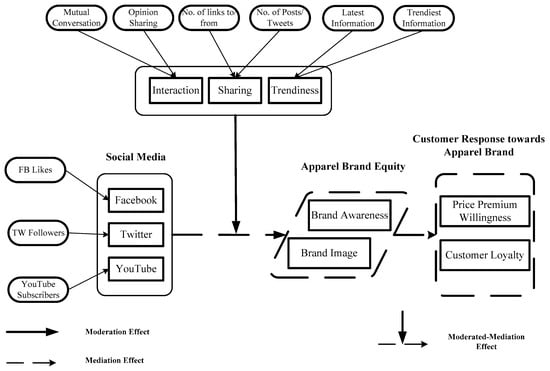 To answer these questions, this study conducted a quantitative survey of Pakistani apparel brands’ customers and tested it through the conditional PROCESS macro in SPSS [30]. The rest of the paper is organized as follows. Section 2 describes the theoretical foundation and previous work. Section 3 deliberates the proposed research design. Section 4 explains the empirical results. Section 5 presents the discussion and practical implications. Finally, Section 6 concludes the paper based on the empirical results.