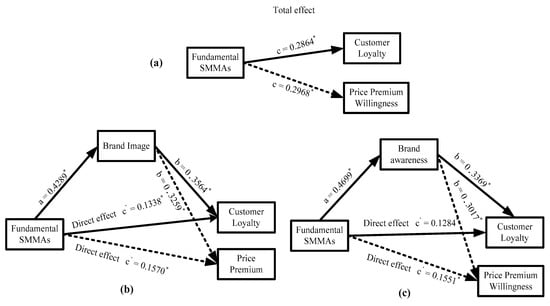 Simple Mediation Using PROCESS macro (Model 4), Direct and Indirect Relationships between Fundamental SMMAs and Price Premium Willingness. (a) Total effect, (b) Brand image as mediator case, (c) Brand awareness as mediator case. Note: * represents the direct effect.