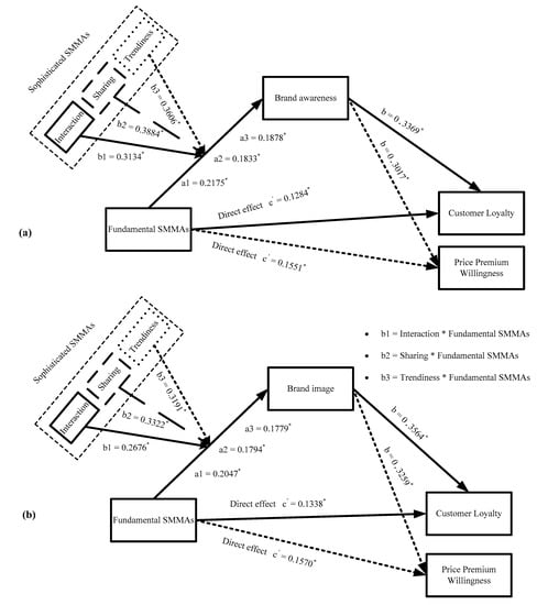 Conditional effects of sophisticated SMMAs on the relationship of fundamental SMMAs and price premium via brand equity (brand awareness and brand image); (a) Brand awareness as a mediator, (b) Brand image as a mediator. All statistical results are significant at p < 0.05.