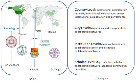 With the development of information technology and the acceleration of globalization, the importance of international academic cooperation has been recognized theoretically and practically. Collaboration generates more knowledge, which, in return, leads to new ideas and academic output [17]. Research collaboration between authors from different places can promote advances in research results and methods in related fields, leading to more effective development outcomes [18]. In addition, academic cooperation can promote the improvement of research quality, improve the efficiency of scientific production, and promote breakthroughs in a shorter period of time [19,20]. However, few bibliometric studies of entrepreneurship focused on international academic collaboration networks have been reported in literature, especially for structural characteristics and evolutionary regulation of international collaboration network for entrepreneurship research in the past 10 years. Moreover, there has been little in-depth research on cooperation between scholars, institutions, cities and countries and a lack of discussion on the relationship between international collaboration and entrepreneurial research performance.