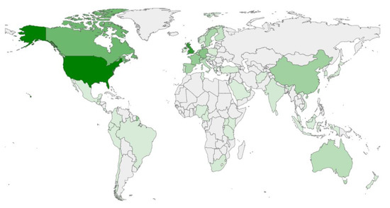 First of all, the countries to which scholars belong were examined. Figure 2 shows the distribution of the entrepreneurial papers in our dataset around the world. The deeper the color, the larger the number of papers published. It can be clearly seen that the United States maintains an absolute advantage in the number of articles published. The United Kingdom, Canada, and some European countries also have large contributions.