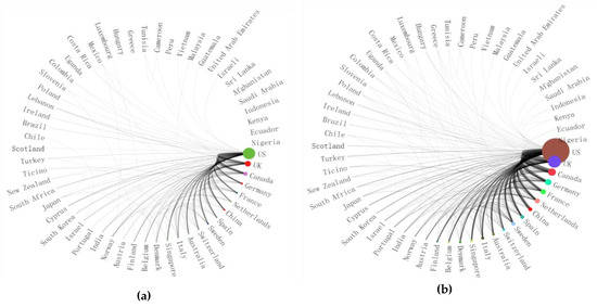 In order to explore the degree of cooperation at different national levels and the general trend of change, two sections of international academic cooperation networks were studied according to international cooperation separated by 2013 (Figure 3). The size of the node indicates the number of articles published, and the thickness of the edge indicates the number of instances of cooperation [34].