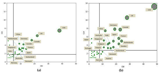 Next, the CBI and CDI were used to reveal the breadth and depth of the collaborative relationships of different countries in two time spans. Figure 4 shows that most countries are migrating to the right, which indicates that almost all countries are actively expanding the scope of their cooperation, but different countries show varying degrees of change. The United States and the United Kingdom continue leading international cooperation. Canada, France, the Netherlands, Germany, and other European countries are in a similar state; they have quite a wide range of cooperation, and although they have not established strong partnerships like the United States and the United Kingdom, they also have good performance. China and Singapore have deepened their partnerships based on original partnerships.