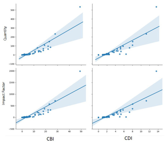 Linear regression of the number and quality of published articles by the CBI and CDI (confidence = 95%).