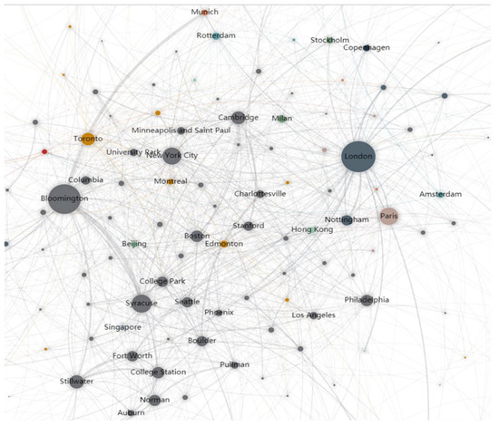 With the development of science and technology becoming an important regional economic unit of a country, the status of cities has become increasingly prominent [39]. As shown in the analysis in the previous section, international academic cooperation has changed dynamically over time. As the next level of the country, research at the city level can directly explain this phenomenon. Therefore, we examined the details of the cities where the organization are located. According to our dataset, 595 cities from different countries participated in international academic collaboration. As shown in Figure 6, the network of cooperation between the cities also presents the characteristics of the core periphery. The performance of American cities is outstanding, which directly explains the central position of the United States in international cooperation. London and Bloomington lead the academic collaboration, but some cities from other countries also have pretty good performance. Munich, Rotterdam, Copenhagen, Stockholm, Milan, Amsterdam, Toronto, Paris, Beijing, Hong Kong also occupy important positions in academic collaboration.