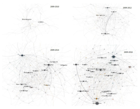 In order to understand how the cooperation network between cities has evolved more clearly, the collaborative networks for different years were analyzed in Figure 7. The central node has continued developing and that the density of cooperation has increased. At first, there were only two central cities, i.e., London and Bloomington, from 2009 to 2010, but in the next two years, New York City and Syracuse in the United States and Paris in France gradually developed into central cities. During that time, Bloomington and Syracuse established a strong relationship that has since continued. Subsequently, the central city continued increasing in influence and established cooperative relationships with the original central city. Cities in other countries, such as Toronto, were booming. This follows the rule that new vertices in the network are preferentially connected to well-connected vertices [40]. This law also appeared in the network of institutions and researchers.