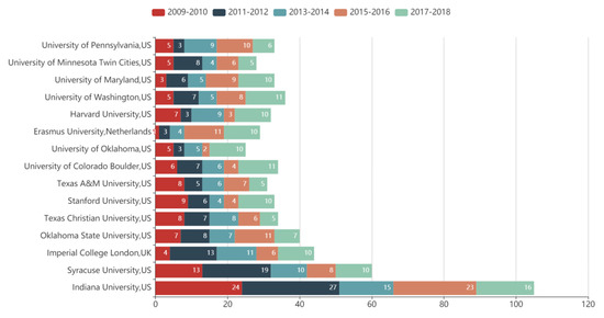 In general, the research levels of a certain country depend on its leading institutions [31]. To a certain extent, prominent institutions can represent a city or even a country. In our research, 878 institutions participated in international cooperation. Figure 8 shows the number of articles published by the top 15 institutions over different time spans. The United States occupied 13 of these seats. In terms of the number, the most central institutions such as Indiana University, Imperial College London and the sub center cooperation agencies such as Oklahoma State University showed opposite development laws. The former’s research was more focused in the early stage, and there is now a tendency to decay, while the latter’s research has been more concentrated in recent years. Some institutions had a focus on research or have no quantitative research at the outset, especially the Erasmus University; however, due to its subsequent development, it has become a central institution. Generally speaking, an institution can represent a city, Bloomington is a central city because of the contact contribution of Kelly Business School, Indiana University, and Syracuse University has made Syracuse a cooperative center. There is no institution from Paris which has become a central institution, although Paris is an important central city. That’s because there are many institutions in Paris, such as Ecole des hautes etudes commerciales DE Paris (HEC), Paris Dauphine University, and École des dirigeants et créateurs d’entreprise (EDC) Paris Business School. Their collective contribution makes Paris a collaborative center. Thus, the institutions have two different ways of contributing to the cities. The first is that one or two famous educational institutions make a city a collaborative center, and such educational institutions are also central institutions such as Indiana University. The second is that a city is central, but it does not include a central institution. Instead, it is replaced by many non-central institutions, such as for Paris.