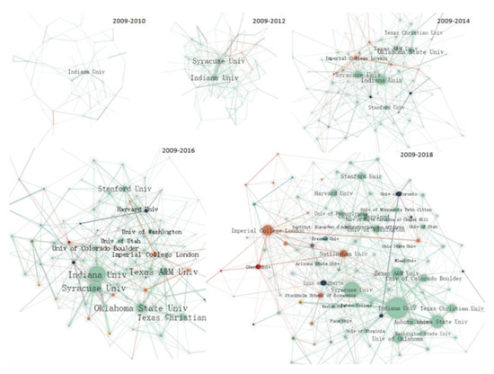 The evolution of the organizations’ cooperative network is roughly the same as that of the cities (Figure 9). As time goes by, the central institutions increase, the cooperation density increases, and the existing cooperative relationships become stronger. The central institutions absorb more collaboration opportunities and make other institutions prioritize their relationships with them. In 2009, there was only one central institution, Indiana University. Subsequently, institutions such as Syracuse University, Imperial College London, and Texas A&M University gradually grew into central institutions and established close relationships with Indiana University. Syracuse University and Indiana University established a close cooperative relationship, which corresponds to the relationship established between their respective cities, Syracuse and Bloomington. Finally, in 2018, a network of multi-cooperative center institutions was finally formed.