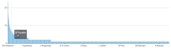 Regardless of the country, city, or institution, the decisive factor in their importance is the scholars. Exploring the core scholars in entrepreneurship research can help researchers track research priorities and find potential partners. The distribution of paper number published by different scholars is shown in Figure 10, where the abscissa represents scholars and the ordinate represents the number of papers. It indicates an obvious long-tail distribution, where 2288 of the 3019 scholars participated in the creation of only one paper in our dataset.