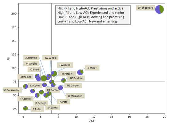 The PII and ACI were used to explore the activities of important scholars in our dataset (Figure 11). In the figure, the sizes of the dots indicate the numbers of published papers, the green parts represent the numbers of papers for international cooperation, and the purple indicates the papers with non-international cooperation. Although these scholars published a large number of papers, they are not the first authors of all of the articles, and the quality of the articles varies. However, in general, the more articles published, the higher the ACI and PII. The black average line divides scholars into four regions, among which HH-type scholars [31] publish papers with high quality and are actively involved in the creation of papers. DA Shepherd has outstanding performance even among HH researchers, and most of his articles have been published at Indiana University. J Wiklund, GD Bruton, and D Miller have similar behavior; they are prestigious and active researchers. As for international cooperation, most researchers except for JC Short and JS Mcmullen pay much attention to international cooperation.