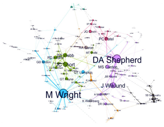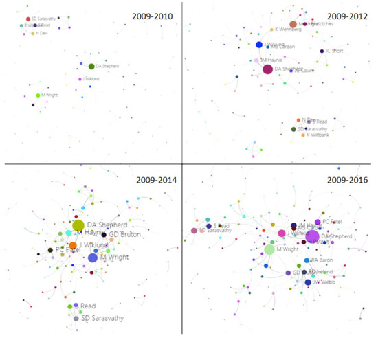 The evolution of the scholars’ cooperative networks is similar to that of institutions and cities (Figure 12), but the initial network structure is very different. There is a clear division of the community among the researchers at the beginning; they are cluster centered on DA Shepherd, cluster centered on M Wright, and cluster centered on SD Sarasvathy. Over time, new central researchers have gradually appeared and participated in collaboration, gradually forming new communities. The cooperation within the original community has gradually strengthened, and the scope of cooperation has gradually expanded beyond the community.