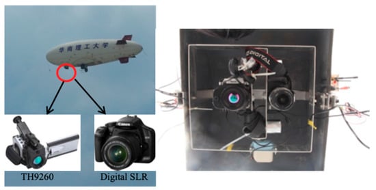 In this study, an unmanned airship was used as a platform (Figure 2), which could lift a payload of up to 10 kg for a flight duration of up to 3 hours. It can automatically maintain the altitude and cruise according to a predefined route. The TIR imaging camera (TH9260) was responsible for taking TIR images that have one band with a spectral range of 8 to 13 μm. The digital SLR camera (Canon 450D with 18–55 mm F/3.5-5.6 IS) was used to obtain visible images. They were both mounted on a double three-axis platform. The favorably large payload and long duration enabled the simultaneous capture of visible and TIR images in one single flight. See Reference [35] for the integration of the whole system.