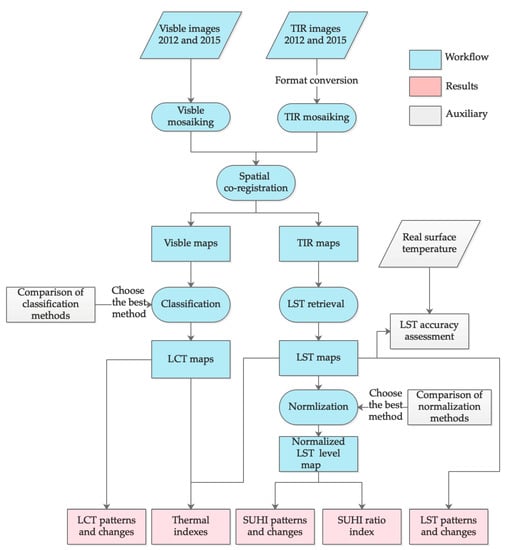 This study aims to determine the effective method to assess SUHI patterns based on LCTs and their changes on a local scale. The workflow is as follows (Figure 3). First, the visible and TIR images obtained by observations are mosaiced and orthorectified to visible and TIR orthophotos. Subsequently, the orthophotos are spatially co-registered to a high-resolution non-offset optical Google map. This is followed by the classification of the LCT from the visible map. Then, an LST map is retrieved from the TIR map based on the algorithm of TH9260. Finally, statistical analyses on LC, LST, and SUHI are performed. The following sections detail these phases and present the relevant data.