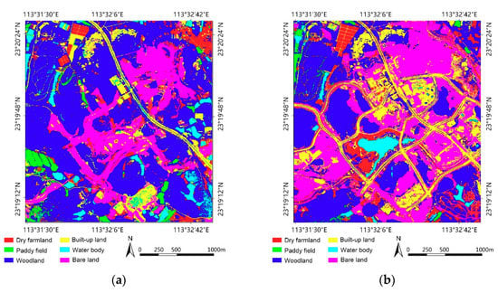 Given the central role of the algorithm in ensuring successful classification, five supervised classification algorithms were deployed in the ENVI software [52]: Maximum likelihood, parallelepiped, minimum distance, Mahal distance, and neural network classification algorithms [53]. Based on land-use characteristics in the study area and spectral characteristics of the visible image, LC was identified and classified into six types: Dry farmland (including crops and lawns), paddy field, woodland, bare land, built-up land, and water body. After the classification, accuracy assessments were performed by comparing the consistency of validation data (over 500 checkpoints for each LCT) and the classification results for the different algorithms. Overall accuracy and kappa coefficient, as well as user’s accuracy and producer’s accuracy, were used as quantitively assessing indexes [54]. Finally, each LCT was extracted from the classified maps for discerning the changes in the areas during the period of interest in ArcMap.