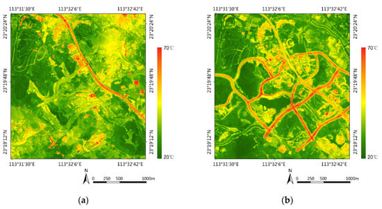 The measured real surface temperature as reference points and the corresponding LST values for comparison are shown in Table 7. The temperature deviations between the retrieved and measured temperatures varied from –0.45 °C to 3.08 °C, and the mean of absolute deviation and RMSE were 1.63 °C and 1.87 °C, respectively. In general, water body, woodland, dry farmland, and paddy field have higher temperature accuracy than built-up land (building roof, asphalt pavements, and concrete pavement), given the relatively stable emissivity of the former four LCT and their temperature ranges that were similar to the ambient temperatures. The temperature deviations of built-up land ranged from 1.65 °C to 3.08 °C, mainly because the emissivity of the man-made impervious surfaces was set to be the same in this study. The broad emissivity of some pavement made by concrete may in fact vary from 0.85 to 0.96 in the database published by the MODIS UCSB Emissivity Library [56,57]. The temperature deviation of water in the Phoenix Lake was –0.45 °C, while the value of pool (small water body) was 1.63 °C, which is because of the much difference in their depth and volume.