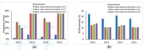 Statistics of surface urban heat island (SUHI) with the different methods: (a) Proportion of area; (b) SUHI intensity.