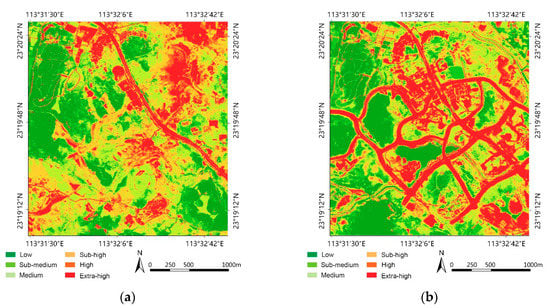 where m represents the level number in the previous normalized step, n the number of the levels higher than the mean temperature, Wi the weight of the levels higher than the mean temperature (the order value of the level in m, for example , the weight value of high and extra-high levels are 5 and 6, respectively), and Pi the area proportion of the SUHI level of i in the study area [59,61].