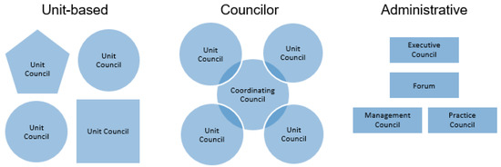 Lapworth [57] claims models of shared governance fall under one of two categories: corporate models, with a focus on governing bodies, and consensual models, which focus on the roles of others. Alternatively, Yanko, Hardt, and Bradstock [58] have identified four different models of shared governance: unit-based, councilor, administrative, and congressional (see Figure 1). In unit-based shared governance models, each unit establishes its own system, which therein creates multiple models within a single institution. In councilor models of shared governance, a coordinating council directs activities on a more aggregate, departmental level, and the unit councils replicate the coordinating council structure. In congressional models of shared governance, all staff belong to a congress, which draws direct comparisons to the federal government. Furthermore, in congressional models of shared governance, committees submit work to a ‘cabinet’ for approval. Finally, in administrative models of shared governance, separate practice and management structures exist, and a forum integrates the work of the councils overseeing these parallel structures.
