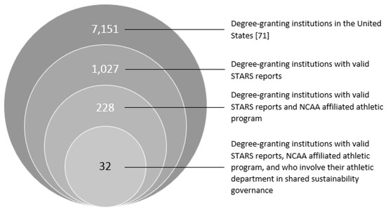 For this study, the population comprised degree-granting institutions in the United States committed to advancing sustainability, which also included a National Collegiate Athletic Association (NCAA)-affiliated athletic program. To access this population, sampling was restricted to universities participating in the AASHE Sustainability Tracking, Assessment and Rating System (STARS), which is a transparent, self-reporting framework for colleges and universities to measure their sustainability performance. Furthermore, STARS is considered “the singular consensus-based tool for use by colleges and universities” [70] (p. 100), and all completed reports are publicly accessible online. In December 2018, at the time of sampling, 228 universities out of a total of 1027 active STARS participants met the inclusion criterion of having an active report at the Bronze level or higher and a NCAA affiliated athletic program. A further review of STARS reports identified the number of universities who involve their athletic departments in organizational-level models of shared sustainability governance. Specifically, involvement was understood through responses within the ‘PA-1: Sustainability Coordination’ credit category where universities were asked to list sustainability committee members, to which a total of 32 institutions emerged. Figure 2 outlines the steps taken to arrive at a target population. [71]
