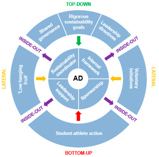 Casper and Pfahl [19] suggest “environmental activities blur lines between distinct management functions making it both a top-down and bottom-up issue at the same time” (p. 24). Figure 3 embodies the notion of the ‘perfect storm’ by organizing the disclosed change levers through not only a top-down and bottom-up approach, but a multidimensional, all-angles approach. Specifically, there are strategic moves that the university could enforce in a top-down manner, or whereby a critical mass could focus attention through bottom-up endeavors. Likewise, there are strategic moves that the university could introduce to incentivize lateral collaboration or involvement in sustainability, as well as measures the athletic department could activate from an inside-out perspective. As such, the identification of these supplemental change levers represent the “nonobvious sources of order that administrators can use to influence dispersed organizations” [4] (p. 211). Table 1 provides additional context and supporting quotations for each of the proposed change levers.