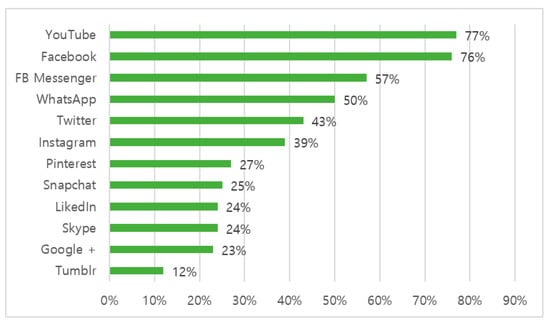 This study obtained information regarding Brexit from the official Facebook pages of the Conservative, Labour, and UK Independence (UKIP) parties. Just after the Brexit referendum, British researchers published a report that analysed the dynamics of the British media, voters, and campaigns. In these reports, Brexit camp members used social media more actively in their referendum campaign than did those who rejected the movement [1]. According to the Office for National Statistics, 89% of British adults use the internet, or nine out of 10 British households have access to the internet via mobile phones, laptops, tablets, or handheld devices [2]. Among these devices, smartphones are used by 72% of British adults [2]; therefore, the Brexit camp actively engaged in a high percentage of internet usage among the British people by utilising social network services for promotion. In fact, according to Figure 1, British voters stated that, of the social network service platforms, they mostly used Facebook or YouTube.
