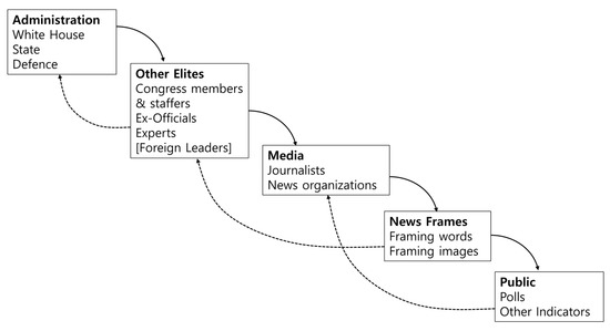 Later, Entman [32] suggested a cascading activation model of framings, wherein individuals in each level of the cascade provide feedback to each other based on their individual framings, which is summarised in Figure 2. In his model, the administration is located at the top of the cascade, then, other elites—such as politicians, ex-officials, or experts—the media, and the public are located at the subordinate levels. When the administrator delivers messages based on their individual framings to the actors in the lower levels of the cascade, those who are in the lower levels of the cascades will accept the information thereafter. At the bottom line, the actors at the lower level provide feedback to the actors at the upper levels [32].