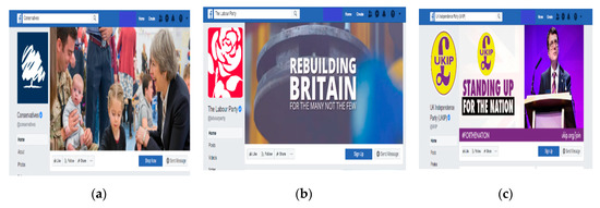 The official Facebook pages of the (a) Conservatives, (b) the Labour Party, and (c) the UKIP.