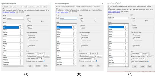 NodeXL is an add-in programme attached to Microsoft Excel, which enables ordinary coders to perform data collection, coding, and visualisation processes. This programme was developed by the Social Media Research Foundation, which continuously updates the analytic functions of this programme. The main features of this programme are network visualisation (e.g., visualising network graphs and setting the colour, shape, size, label, and opacity of vertices and edges), social network analysis (e.g., calculating overall network metrics such as density and modularity, basic vertex metrics such as degree, in-degree and out-degree, and group vertices by cluster or attributes), content analysis (e.g., text analysis, sentiment analysis, time series analysis, and top items, such as words, word pairs, URLs, and hashtags), and data import and export from other analytic programmes such as, GraphML, Pajek, UCINet, matrix, and MS Office [40]. In the coding process, we employed the feature called “Import from Facebook Fan Page Network” (Figure 6) to collect existing comments, posts, and replies. The data collection period included a range from the date of the Brexit referendum (23 June 2016) to the date that the Brexit deal was made (25 November 2018).