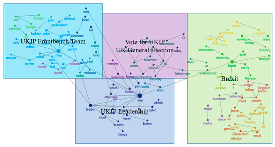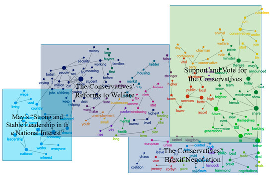 As shown in Figure 9, Brexit can be seen as a large block, and the contents within this block can be understood as appeals to public emotions (as opposed to policies). The unique characteristic of the UKIP results is that they were focused on fishery rights, border control, and the fundamental idea of Brexit as Article 50 of the Lisbon Treaty. Overall, the UKIP did not provide a specific alternative but, rather, leaned on the emotional appeal of Euroscepticism to influence the Brexit vote. In their 2017 general election manifesto, the UKIP promised the following: to quit the jurisdiction of the European Court of Justice, to form the EU single market and customs union, to restore “full maritime sovereignty”, to pay neither “divorce” money to the EU nor to contribute to the EU budget, and to complete the Brexit process by the end of 2019. At present, none of these promises have been fulfilled, and some of these promises contained false information. As such, the UKIP lost the election in a catastrophic manner. They still maintain Hard Brexit in their political stance; however, they do not have the same level of public support today as they did on referendum day because they have broken too many past promises.