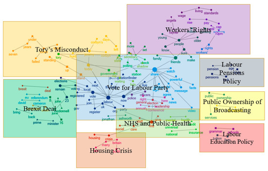 After the data import of the Facebook postings of these three official pages, automatic text analysis was conducted by selecting word and word pair metrics dialogue. These metrics calculated the most frequently mentioned word pairs within the postings of these Facebook pages. Based on the collected word pairings, NodeXL can create word clusters according to their semantic relatedness. Subsequently, NodeXL can visualise them in the format of semantic network maps. These results are presented in Figure 7, Figure 8 and Figure 9. Figure 7 displays the results of the Conservatives’ official Facebook page from the day of Brexit referendum (23 June 2016) to the day of Brexit deal released (25 November 2018).