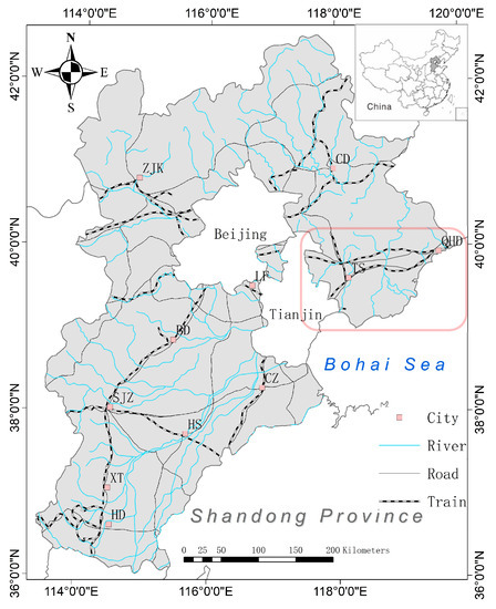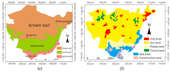 The research area is located to the east of Hebei province, bordering the Bohai Sea in the east and south, adjacent to Tianjin city in the west and the Yanshan mountain in the north, with a total area of 13,472 km2. The administrative districts belong to Tangshan (TS) and Qinhuangdao (QHD), including Zunhua, Yutian, Qianxi, Qian’an, Luanxian, Luannan, Laoting, and Tanghai. The geographical coordinates are: 117°31′–119°19′ E, 38°55′–40°28′ N. The local area is a temperate monsoon area with a continental climate. The annual average temperature is 12.3 °C, the annual average precipitation is 650 mm, and the annual evaporation is 1800 mm. The local river system is well developed and can be divided into four river systems: the Luanhe river system, the Sha and Dou river system, the Jihe river system, and the eastern coastal system (Figure 1) [29]. According to the general survey of soil in Hebei province, there are three kinds of soil types in the area, including brown soil, moist soil, and saline soil (non-wheat growing areas) (Figure 2). Jidong plain is located in the Beijing–Tianjin–Tang–Qin Bohai economic zone and is an important agricultural production and supply base in northern China that is rich in wheat, corn, and other food crops and peanuts, as well as cotton and other cash crops. In addition, industrial and mining activities are also very commonplace.