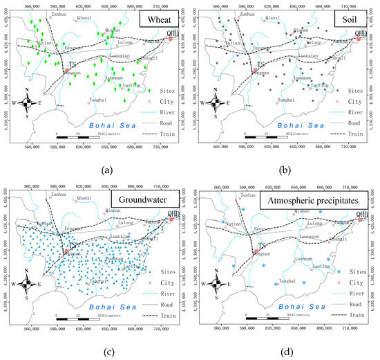 Soil (S) and wheat (W) samples were collected during the wheat harvest. A total of 46 pair samples were carried out at random in the wheat planting region of the Jidong plain. The weight of each soil sample collected was 1 kg, the depth of the soil sample was 0–20 cm, and the weight of each fresh wheat sample was about 2 kg. Soil samples taken from fields were placed in a clean storage room and spread in a thin layer on the sample tray. The samples were placed indoors to keep them cool and avoid sunlight exposure. Meanwhile, the samples were strictly prevented from being polluted by other things. The dried S samples were then ground according to the chemical analysis requirements and put into a sample bottle for storage. Next, labels and other marks were made inside and outside the bottle. The W agricultural products were rinsed in a fresh state just after being collected to remove the adhesion soil and pollution caused by fertilization and pesticide spraying and then rinsed with distilled water 1–2 times and dried at room temperature. The samples were sent to the laboratory after passing through a 20-mesh sieve (<0.85 mm). After air-drying and mixing at room temperature, the S samples were reduced to 200 g. An agate pollution-free sample preparation machine was used to smash the samples to 100-mesh sieve (<0.15 mm), and the samples were bagged for later use.