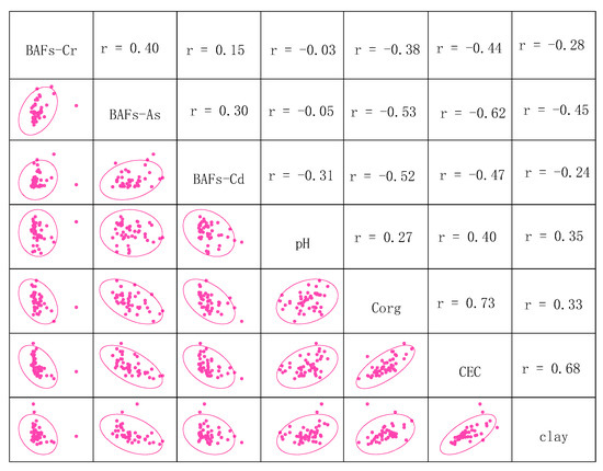The bioaccumlation factors of Cr, As, and Cd from wheat to soil (calculated using Equation (3)) were: 0.069%, 0.364%, and 45.927%, respectively. This result indicates that the bioaccumulation factors of Cd (close to 50%) were far higher than those of Cr and As. Building the relationship between the trace elements and soil properties (pH, CEC, Corg, and clay) in this study (Figure 3) showed the negative correlation of soil properties and the bioaccumulation factors of Cr, As, and Cd. The correlation coefficient of soil properties and the bioaccumulation factors for Cr, As, and Cd (at p < 0.01) were −0.03, −0.05, and −0.31 for pH; −0.38, −0.53, and −0.52 for Corg; −0.44, −0.62, and −0.47 for CEC; and −0.28, −0.45, and −0.24 for clay, respectively.