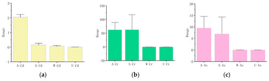 The error bars of the trace elements Cd, Cr, and As in the study area (A, atmospheric precipitates; S, soil; W, wheat; G, groundwater): (a) the contents levels with error bars for Cd, (b) the content levels with error bars for Cr, and (c) the content levels with error bars for As.