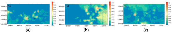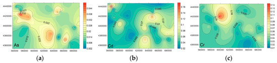 The predicted map of Cr, Cd, and As in S in the Jidong plain area: (a) the predicted map of As in the study area, (b) the predicted map of Cd in the study area, and (c) the predicted map of Cr in the study area.